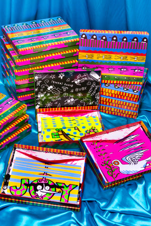 6 cards printed with day-glo ink and flocked with fuzzy black velvet in the USA