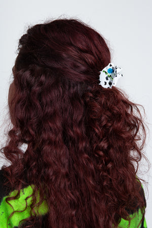 small acetate piggy claw clip with paint-filled engraving and rhinestone necklace