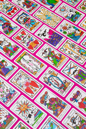 this full deck is comprised of the traditional major arcana, cups (represented as hearts), swords, batons (represented as bones), and pentacles. 78 cards in total.