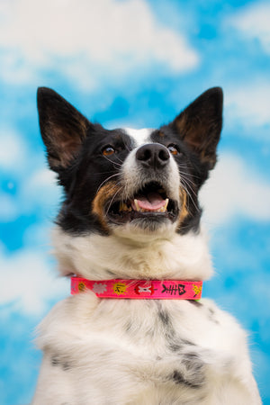 give your dog a sweet accessory with this collar that features all the most beautiful things (banana peels, fish skeletons, apple cores, and partly-cloudy days) on hi-vis neon pink!