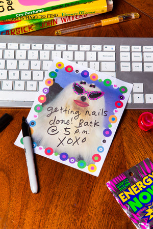 this pad is the same size as our fancy scratch pads BUT it features a gentle sticky strip at the top so you can have diva remind you of anything, anywhere, any time!