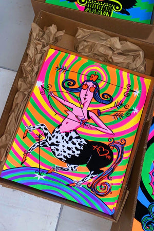 flocked velvet poster screenprinted with neon inks that fluoresce (word?) under blacklight or just pop during normal light!