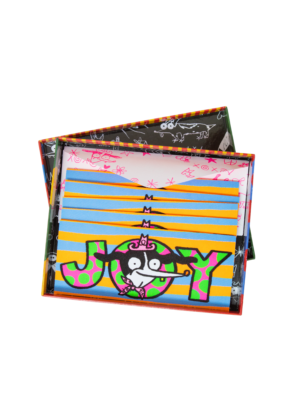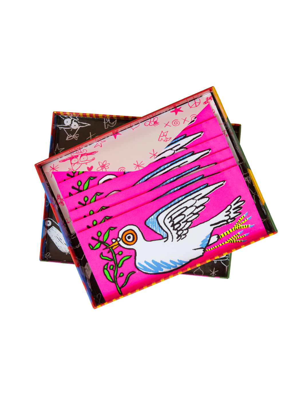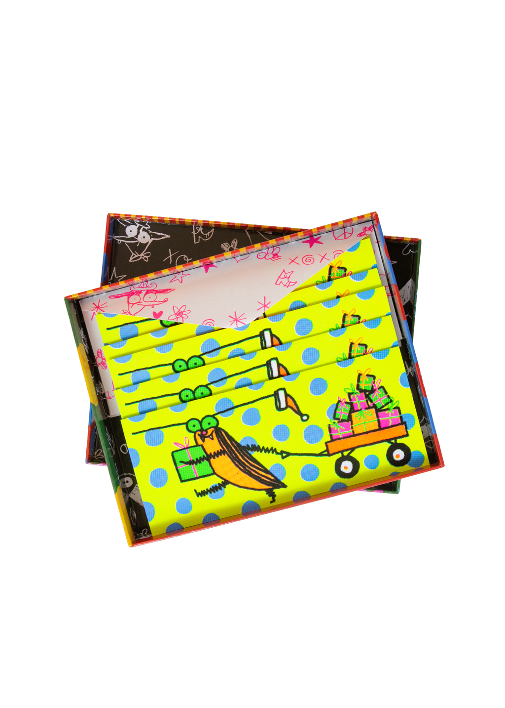boxed in a glossy, lidded box with 6 matching bubblegum pink doodle envelopes