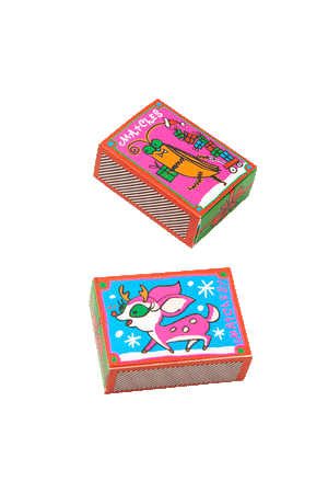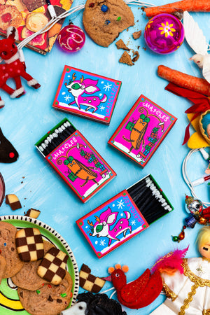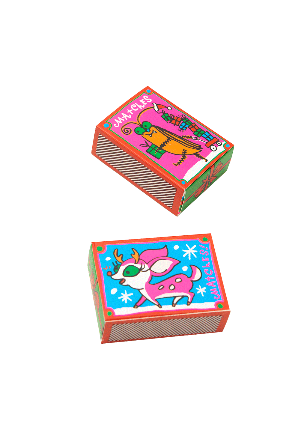 black safety matches with white tips stocked in a reversible, fully-printed drawer box with 2 strike pads