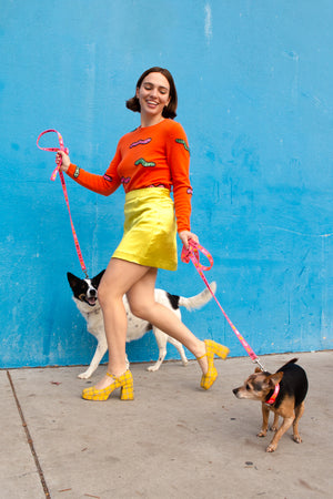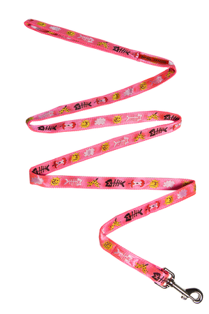 a jaunty hi-vis neon pink leash featuring garbaggio like banana peels, apple cores, fish skeletons, & a very jaded sun on a cloudy day