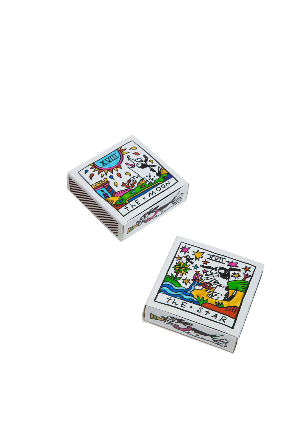 box of matchsticks with 2 striker stickers featuring artwork inspired by the cowgirl tarot