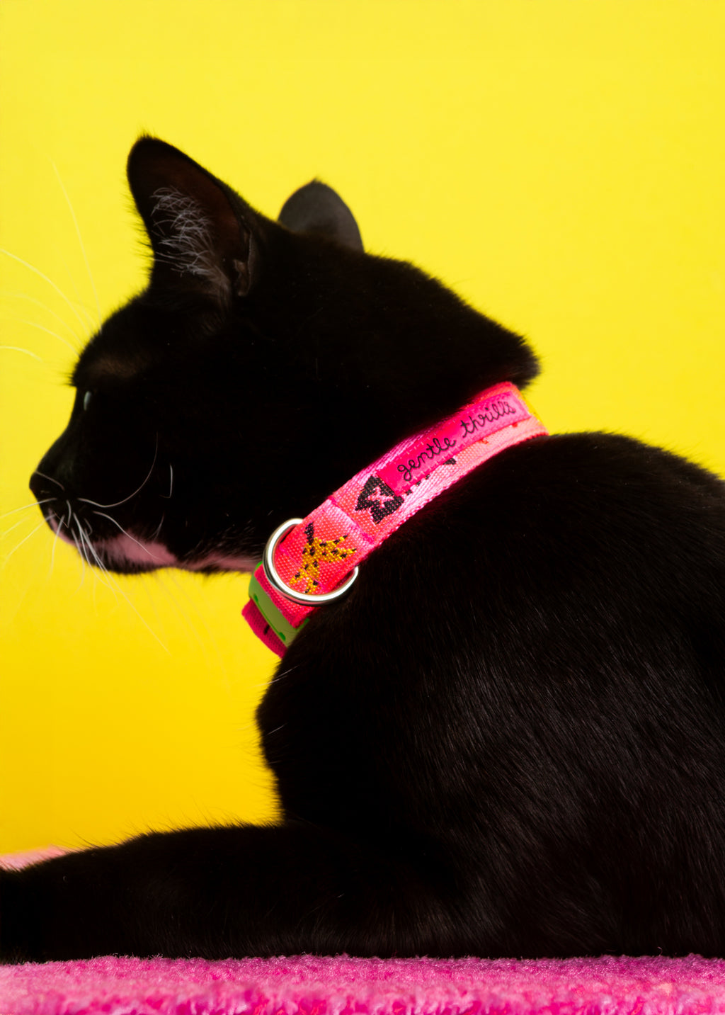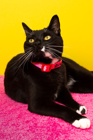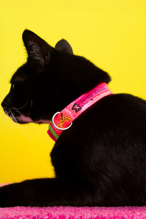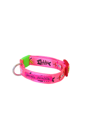 give your kitty a sweet accessory with this collar that features all the most beautiful things (banana peels, fish skeletons, apple cores, and partly-cloudy days) on hi-vis neon pink!