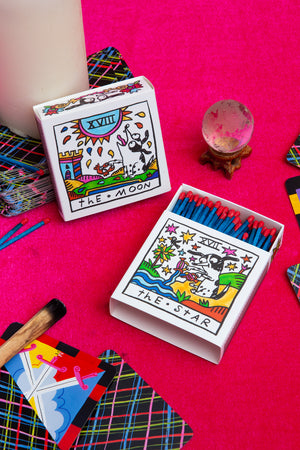 box of matchsticks with 2 striker stickers featuring artwork inspired by the cowgirl tarot