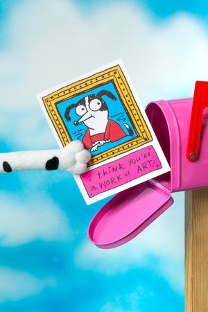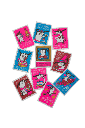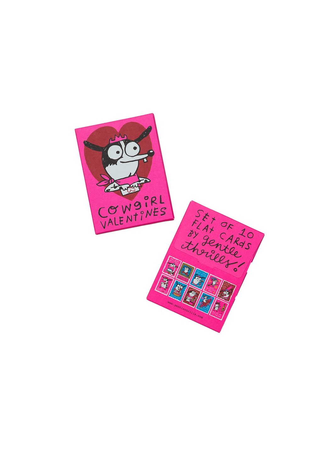this year's set is a hot pink paper box stocked with 10 flat cards printed on uncoated paper. each box includes all 10 designs pictured. no envelopes!