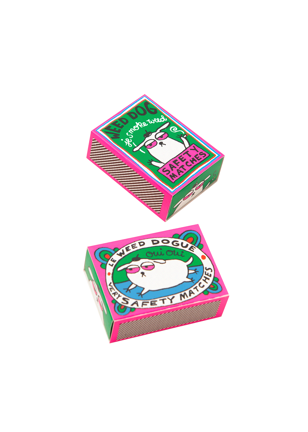 black safety matches with white tips stocked in a reversible, fully-printed drawer box with 2 strike pads